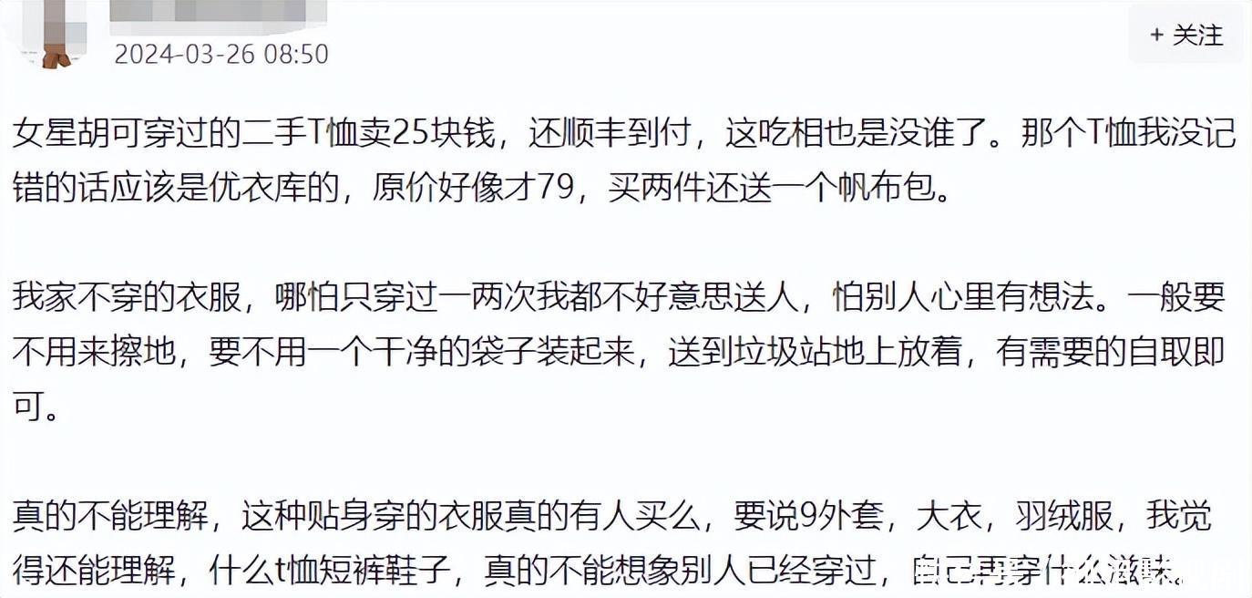 该网友称,哪怕是我方一个普通东说念主,穿过的一稔送东说念主王人不好意旨道理,一般王人是拿来当抹布擦地,要说那种贵的大衣羽绒服挂在网上卖还能融会,也搞不懂为什么还有粉丝买二手T恤给我方孩子穿。